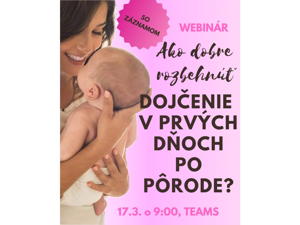 Ako naštartovať dojčenie už v pôrodnici? Ako má vyzerať správne prisatie a ako ho docieliť? Ktoré pomôcky pri dojčení určite oceníte a ktoré naopak vôbec nepotrebujete? Dozviete sa vo webinári “Ako dobre rozbehnúť dojčenie v prvých dňoch po pôrode”. Webinár trvá cca 50 min. a po jeho ukončení dostanete záznam, ktorý si môžete prehrať po dobu dvoch týždňov.